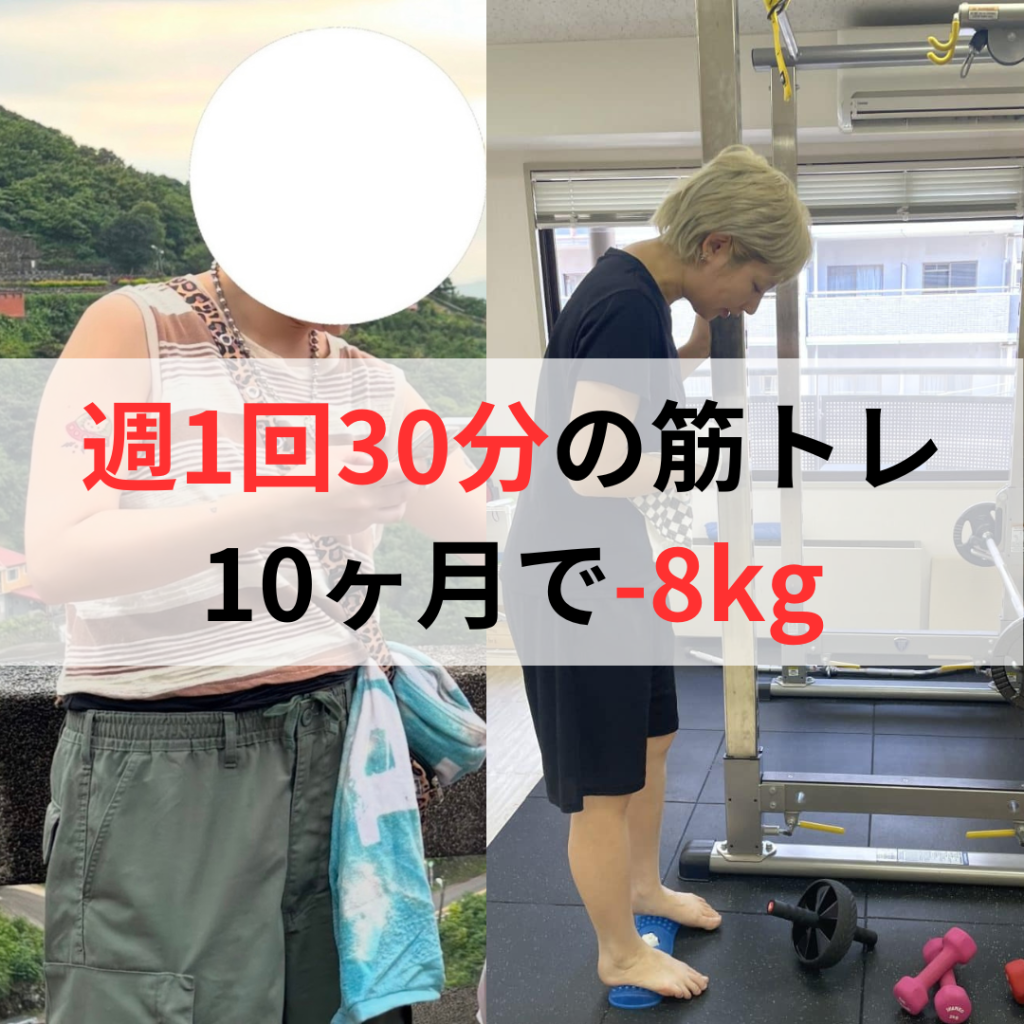 ②緩やかなダイエットとして、お食事は特に気にせず食べすぎない程度に、ご自宅の運動も特にせず、週に1回30分のパーソナルトレーニングのみで8kgのダイエットに成功しました!