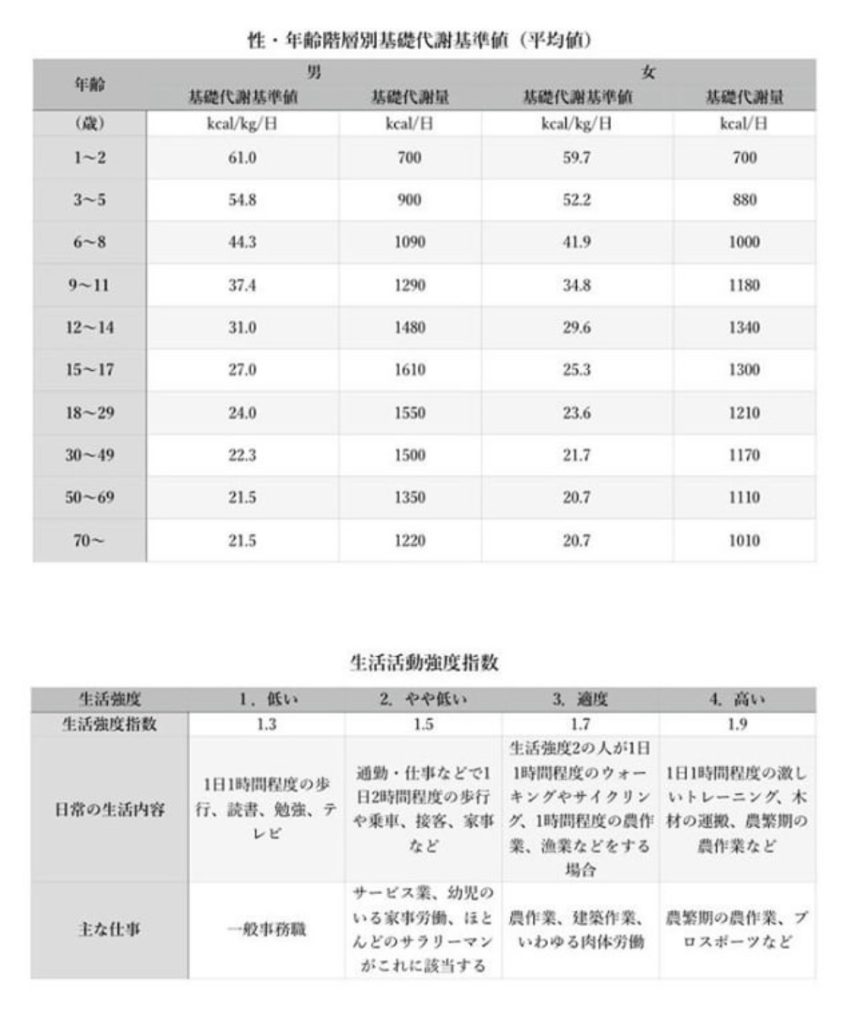 まずは自分の1日の消費カロリーを知ります こちらの表で自分の基礎代謝をチェックし、活動代謝(生活強度指数1.3~1.9)を掛けていきます。