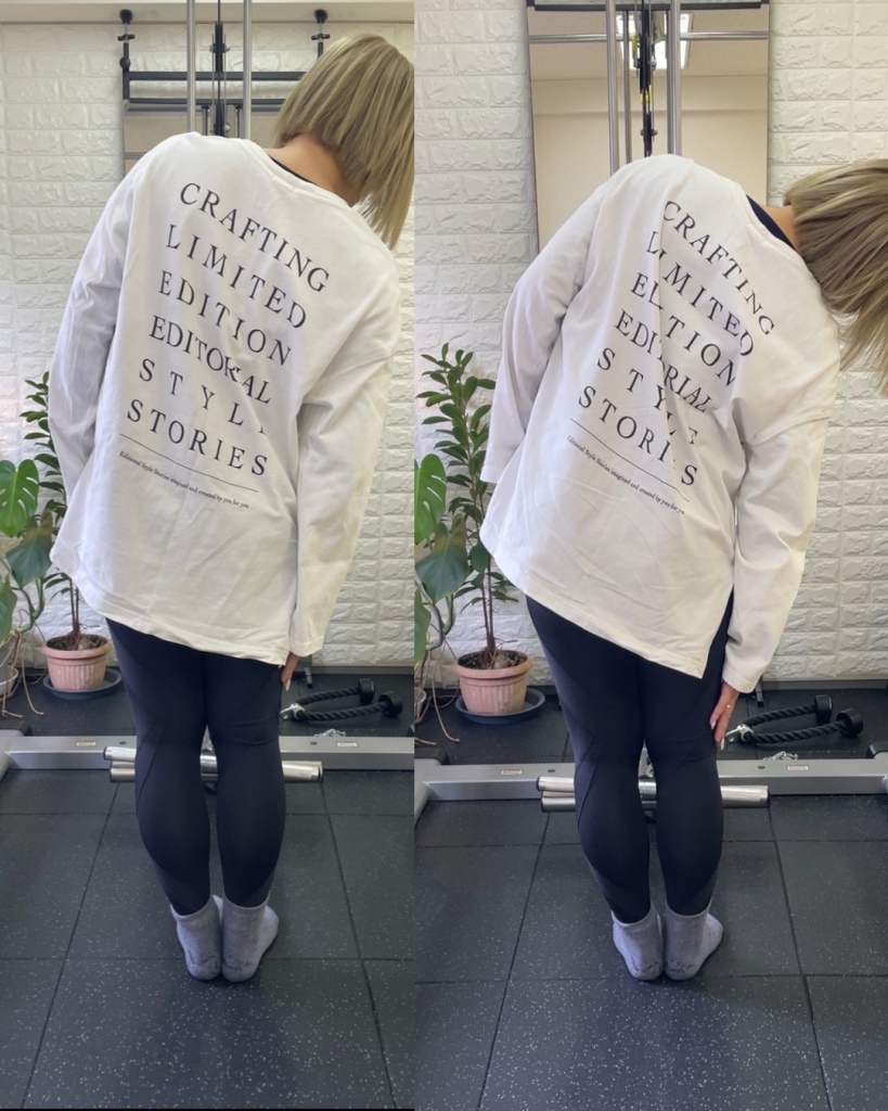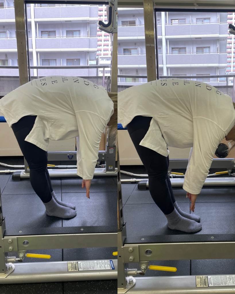 初回体験時の姿勢や動作のチェックにて、背骨の前屈後屈、側屈、回旋が硬いこと、ふくらはぎ、ももの裏の硬さが判明しました
